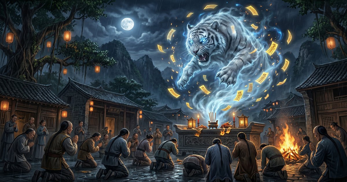 The villain hitting history begins with a creature that doesn't exist — or perhaps, one that exists precisely because people believe in it. The White Tiger (白虎) is a celestial being in Chinese cosmology, one of the Four Symbols guarding the cardinal directions. In folk belief across southern China, the White Tiger represents malice, betrayal, and the petty person — the backstabber who smiles to your face and ruins you behind your back.